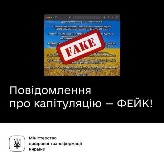 Останні кілька днів українців попереджали, що можуть з'явитися фейки про капітуляцію України або конкретної області. Перші такі повідомлення були опубліковані на вже зламаних сайтах держорганів Вінничини, Херсонщини та Стрия. Також подібні тексти з'являються і в різних ЗМІ та соцмережах. ЦЕ ОЧЕВИДНИЙ ФЕЙК, оскільки ніхто з українців не збирається здаватися в цій війні.